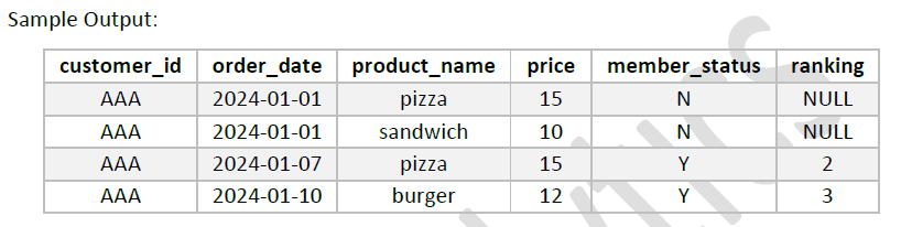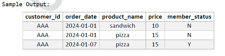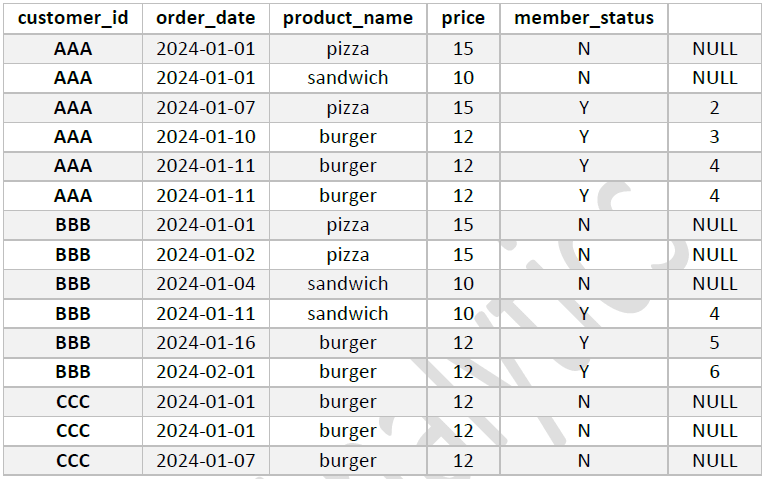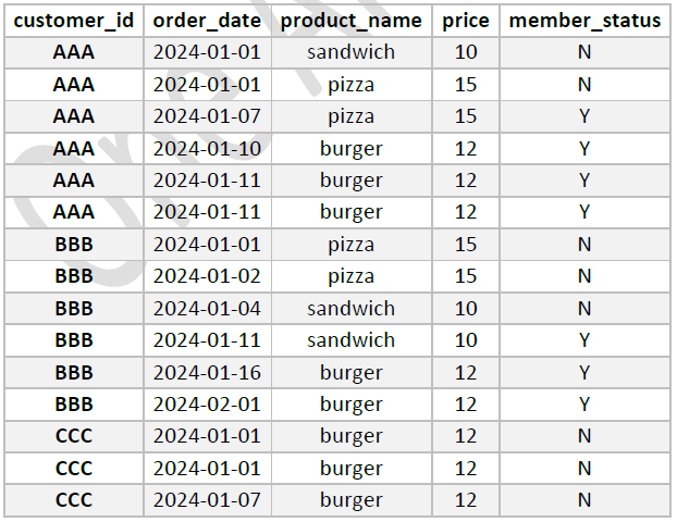 customer_id, order_date, product_name, price, member_status (Y/N)